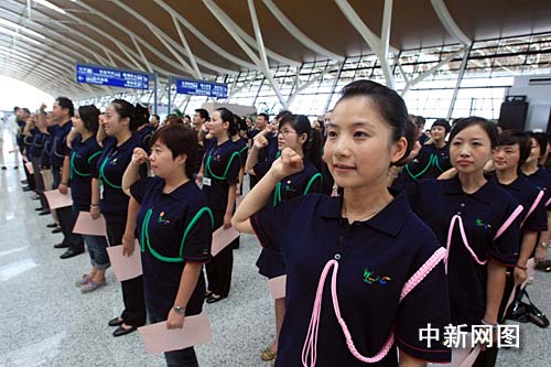 中新網(wǎng)上海9月4日電 (;萦ⅰ√K巍巍) 9月4日上午,上海機場集團在浦東機場T2航站樓舉行了上海機場世博志愿者服務總隊成立儀式,120名身著統(tǒng)一服裝的志愿者代表在9名勞模的帶領(lǐng)下莊嚴宣誓,“我志愿成為一名光榮的上海機場世博志愿者。我承諾:盡已所能,不計報酬,幫助他人,服務社會。”上海機場集團副總裁、上海機場世博志愿者服務總隊第一副總隊長朱寧一向4支志愿者服務隊授牌。