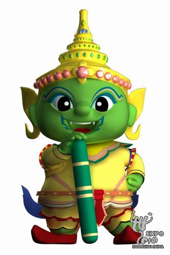 “小阿泰”名字來自泰語的“THAI”(自由和獨(dú)立),設(shè)計(jì)靈感來自守護(hù)在泰國寺廟門前的泰國守門神夜叉“INTARACHIT”塑像,這個(gè)可愛的小巨人以他彬彬有禮、充滿歡樂的微笑象征著泰國人的熱情好客!靶“⑻钡木G色皮膚代表富饒的泰國大地,橢圓形的大眼睛如同泰國人友好和善良的心靈窗口,自然純真的微笑充滿著溫馨和友善,手握的巨棒具有創(chuàng)造幸福、實(shí)現(xiàn)夢(mèng)想的神奇威力。