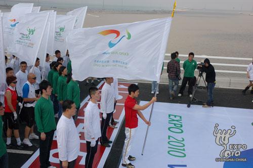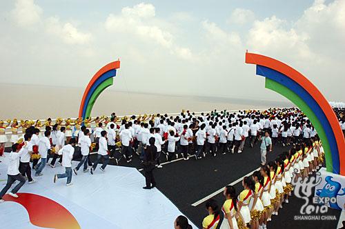 共青團(tuán)上海市委書記、上海市世博會籌備工作領(lǐng)導(dǎo)小組志愿者組副組長潘敏為“大橋跑”發(fā)令起跑。起跑前,21名少女手捧取自沿長江21個城市采集而來的母親河水水樣,匯入長江入海口,表達(dá)了志愿者的拳拳赤子之心,也表達(dá)了志愿者對上海世博會的美好祝愿。