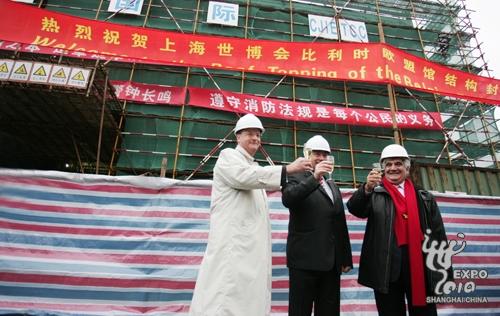 自破土動(dòng)工之日起僅三個(gè)月時(shí)間,位于上海世博園區(qū)C片區(qū)的比利時(shí)—?dú)W盟館便宣告結(jié)構(gòu)封頂。昨天下午,比利時(shí)—?dú)W盟館舉行結(jié)構(gòu)封頂儀式,歐盟駐華大使、上海世博會(huì)歐盟館總代表賽日安博和上海世博會(huì)比利時(shí)展館總代表戴明哲與來自歐盟和比利時(shí)的官員,一起見證了展館建設(shè)進(jìn)程中這一具有里程碑意義的時(shí)刻,安博也首次介紹了歐盟展區(qū)的展示方案。