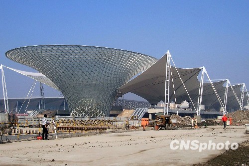 世博軸工程將于2009年底竣工。世博軸設(shè)計獨具匠心,既有引陽光入地下,減少照明能耗的巨大杯狀陽光谷,也有為參觀者遮陽擋雨、綿延輕透的世界最大索膜結(jié)構(gòu),這些鮮明特征使世博軸成為上海世博會的一大標(biāo)志。世博軸是2010年上海世博會的主入口、中央安檢通道和人行立體交通、服務(wù)樞紐。圖為11月26日拍攝的藍天下的上海浦東世博園區(qū)的世博軸工地。中新社發(fā) 周東潮 攝