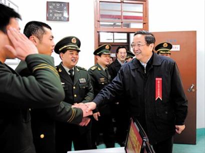 俞正聲和丁薛祥、陳豪、胡延照、王新奎、張學兵等來到武警上海市總隊世博安保任務(wù)部隊某部,實地察看值班室,聽取園區(qū)安保情況介紹;走進部隊營房,與武警戰(zhàn)士親切交談,了解戰(zhàn)士們的訓練、生活情況。聽到戰(zhàn)士們對生活保障表示滿意,俞正聲十分高興,他說:“春節(jié)即將來臨,請向你們的家人問好。今年迎辦世博的任務(wù)很繁重,相信通過大家的共同努力,我們一定能實現(xiàn)平安世博的目標!睉(zhàn)士們鏗鏘作答:“為世博爭光彩,為祖國作奉獻,永遠做黨和人民的忠誠衛(wèi)士!