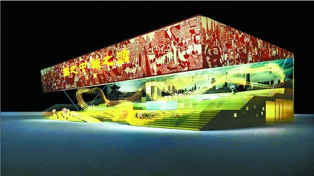 據(jù)介紹,河南館的建筑外形由一個“中”字變形而來,分上中下三層空間,其中中部構(gòu)成一個全開放的坡面空間,為展館主體,上層空間主要是穹頂裝置,下層空間則設(shè)計為一個藏寶室。展館主體空間,也就是中部的坡面空間,各展項依照“河南城市文明的盛大游行”概念,按時代順序組織排列。在設(shè)計上,除了各項多媒體裝置在內(nèi)容上的呼應(yīng)支撐外,還由數(shù)千個文物復(fù)制品、人物模型組成了一個實體的、起伏綿延的游行隊伍,再加上繽紛變化的燈光效果,整個主體空間呈現(xiàn)給人的仿佛是一場盛大演出。