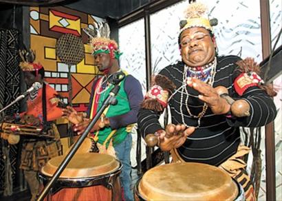 餐廳內(nèi)用非洲圖騰繪制成彩色墻面,由鴕鳥蛋做成精致吊燈,樹枝和草帽拼接裝飾屋頂,頗具非洲原生態(tài)氛圍。餐廳二樓設(shè)有一個(gè)小舞臺(tái),就餐時(shí),身著非洲傳統(tǒng)民族服飾的非洲團(tuán)隊(duì)還會(huì)在舞臺(tái)表演。(鐘怡 徐蒙)