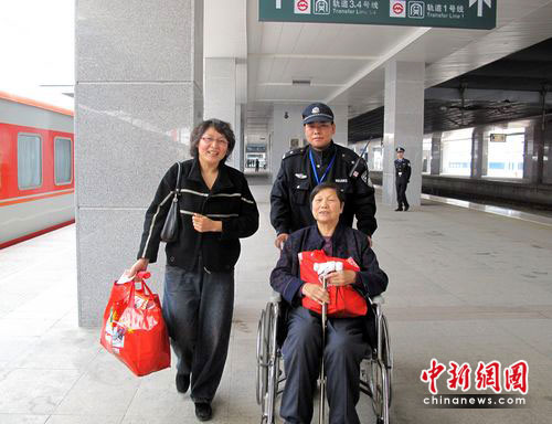 中新網(wǎng)徐州4月24日電 (耿晴 張良燦 侯啟光)“您好,我是上海鐵路民警,請(qǐng)問(wèn)要到哪去?輪椅我來(lái)幫您推! ”在上海火車站6號(hào)候車室,來(lái)自徐州鐵路公安處援滬安保民警邊詢問(wèn)邊接過(guò)一旅客手中的輪椅!奥闊┠鷰兔α,我媽身體不好只能坐輪椅,謝謝!”身后,一位拿著兩個(gè)大包裹的中年女性旅客連連道謝,民警會(huì)同世博志愿者一直將老人送上了列車。