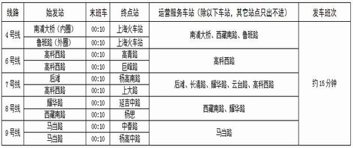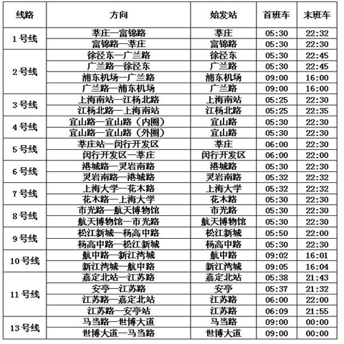 軌道交通4、6、7、8、9五條涉博線路在常規(guī)末班車后,將在世博園周邊站點(diǎn)加開(kāi)加班列車,除重點(diǎn)涉博車站以外,其他途經(jīng)車站只可下客出站,不可進(jìn)站上客和換乘。加開(kāi)列車末班車時(shí)間為0:10,運(yùn)營(yíng)間隔約為15分鐘一班。具體車站的首末班車時(shí)間還可查看各車站公告、至上海地鐵官網(wǎng)(/) 進(jìn)行查詢或撥打地鐵服務(wù)熱線64370000進(jìn)行詢問(wèn)。