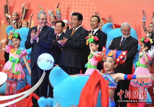 致辭完畢,賈慶林與讓·皮埃爾·藍(lán)峰共同啟動(dòng)開(kāi)園按鈕,象征性地開(kāi)啟了2010年上海世博會(huì)的大門(mén)。按鈕啟動(dòng)后,前方一個(gè)裝置設(shè)備上的圓環(huán)慢慢圍繞一把“金鑰匙”旋轉(zhuǎn)起來(lái),形如一個(gè)地球儀,效果令人印象深刻。