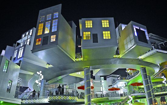 很多場館在設(shè)計時,就考慮了夜間效果,用燈光展示場館的另一面。浦東園區(qū)“燈光秀”的主打陣地是“一軸四館”。要欣賞夜景,首選地是世博文化中心:白天,它是潔白的巨型飛碟;夜晚,它變身神秘的“浮游都市”。