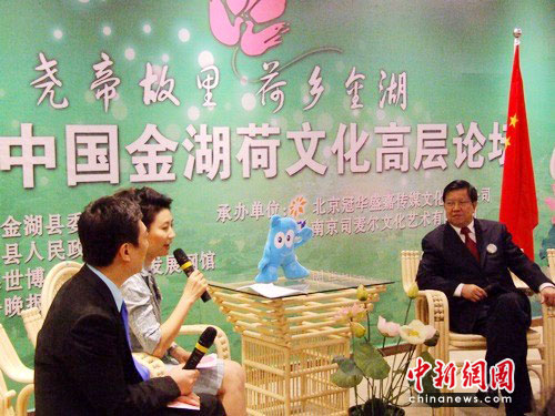 本屆論壇是第十屆中國金湖荷花•美食節(jié)的高端活動之一,借助世博會的平臺,讓荷文化作為金湖的形象大使,牽手世博,走向國際,發(fā)展金湖。論壇一改過去嘉賓輪流上臺發(fā)言的設計,采用央視訪談欄目的場景設計和節(jié)目流程,由央視名嘴陳偉鴻、王小丫現場主持。出席論壇的嘉賓們在主持人的引導下,聯系金湖發(fā)展和各自實際,圍繞“荷”氣生財論經濟、以“荷”為媒說規(guī)劃和政通人“荷”談民生三大論題進行現場訪談。