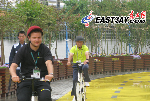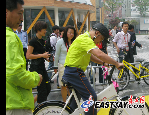黃綠色的李寧運(yùn)動(dòng)短T,深色的李寧網(wǎng)球褲,白色的李寧運(yùn)動(dòng)鞋,再加一頂黑色的李寧鴨舌帽,今天上午10點(diǎn)半左右,在各路記者的簇?fù)硐,昔日體操王子李寧出現(xiàn)在世博會(huì)浦西城市最佳實(shí)踐區(qū),從馬德里案例區(qū)出來后,出現(xiàn)在了歐登塞展區(qū),看著路邊停放著的一整排自行車,李寧也過了一把騎車癮,引起了游客的圍觀。