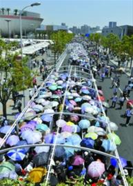 當記者沿著世博軸緩步來到博成路高架步道下方的沙特館排隊區(qū)域入口時,時間已是9:25。入口處的沙特館工作人員手上的告示牌已經(jīng)寫著“沙特館排隊時間約8小時”,不少游客看到標示后就放棄了排隊,但更多的游客選擇繼續(xù)堅持。已經(jīng)73歲的付老先生說:“之前就選定傳聞中很好看,但排隊時間長的沙特館作為世博游第一站,下定決心要把最難排到的場館先看掉!崩先耸虑耙褱蕚浜谜陉柮薄y帶式小椅、食物和水等物品,即使真要排9小時也要堅持下去。
