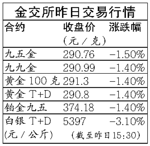 金價(jià)從上周五開(kāi)始“四連跳”,受此影響,昨日國(guó)內(nèi)金價(jià)也震蕩收低,跌幅達(dá)1.44%。