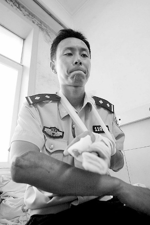 王梓的左手已經被包扎上,紗布上面滲出很多鮮血。王梓的上肢到處都有很嚴重的擦皮傷,警褲多處已經撕裂。