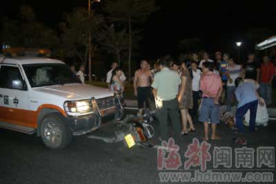 事發(fā)8月17日晚近10時(shí),黃先生說:“太突然了,我一下被撞飛,當(dāng)時(shí)馬上暈過去了。”當(dāng)晚,他和幾個(gè)同事在江濱路大排檔吃完飯后,分乘兩輛摩托車沿江濱路由東往西行駛,他開的摩托車上載著同事周女士。途經(jīng)洋老洲游泳池附近時(shí),黃先生突然感到后面有車撞來,他和周女士被撞倒并被往前面推行了10多米,接著他就暈過去了。