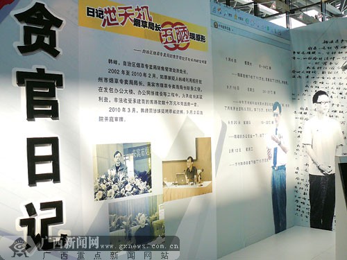 展廳中引人矚目的,是曾“名噪一時(shí)”的自治區(qū)煙草專賣局原銷售處處長、來賓市煙草專賣局原局長韓峰!叭沼浘珠L”也進(jìn)入展覽,引來眾人圍觀。