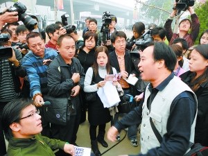 在昨天審理肖傳國一案的同時(shí),法院大門外也上演著一場(chǎng)“庭審”:接受肖氏術(shù)的患者和家屬以及肖傳國的支持者都自稱自發(fā)來到法院,形成兩個(gè)鮮明陣營,將原本在網(wǎng)上互相發(fā)帖拍磚的論戰(zhàn)搬到了這里。