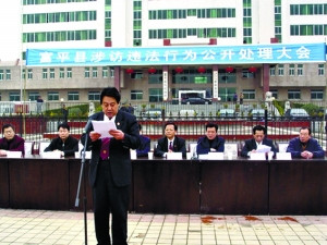 回應(yīng):記者在富平縣法院網(wǎng)看到該網(wǎng)站刊載了一張公開處理大會的照片,3月5日當天,站在富平縣政府廣場上念稿子的官員正是該縣法院副院長奧繪。背后列席的官員中,該縣政法委及法院的主要領(lǐng)導都在。