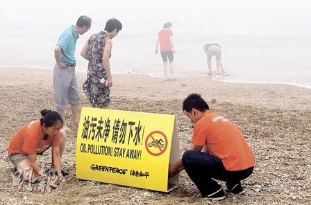 環(huán)保組織綠色和平昨日指出,受漏油意外污染的大連一帶海域,黑色油污已漸被清理,但海面仍漂浮油層。為保護(hù)游客安全,綠色和平在棒棰島等海濱浴場已豎立警示牌,提醒游人“油污未凈,請勿下水!”