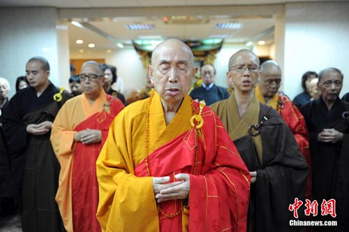下午2時許,港島灣仔的香港佛教聯(lián)合會的會場,會長覺光長老主持拈香。他身后還有智慧法師、紹根法師、融靈法師等會內(nèi)長老,都內(nèi)穿黃色衣衫,外披紅色水田格袈裟。兩側(cè)恭敬站立著近30位佛教居士,著黑色海青和褐色袈裟。