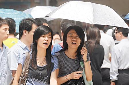 天文臺(tái)昨午錄得香港今年最高氣溫三十四點(diǎn)一度,上水及跑馬地氣溫更一度高達(dá)三十六點(diǎn)四度,打鼓嶺、沙田、石崗、深水埗、九龍城、黃大仙、觀塘、將軍澳及香港公園,最高氣溫也破三十五度。酷熱天氣警告由周一生效至今,已逾六十小時(shí)。