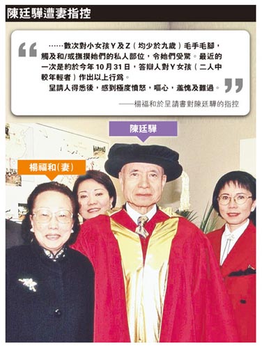 在楊福和控告次女之前,原來早于去年12月9日已向家事法庭提出離婚呈請。楊福和當(dāng)時(shí)向法庭提出,丈夫于2004至2005年期間,曾經(jīng)作出不合理行為(unreasonable behaviour),二人不能再共同生活。到今年10月2日,楊福和向法庭呈交補(bǔ)充資料,指陳廷驊曾經(jīng)對身邊傭人及護(hù)士作出不當(dāng)行為,令她憶起丈夫過去曾經(jīng)不忠,楊福和更透過律師稱,陳廷驊曾摸兩名年僅8歲及5歲的曾孫女,楊感到羞恥,稱不能接受有關(guān)行為。