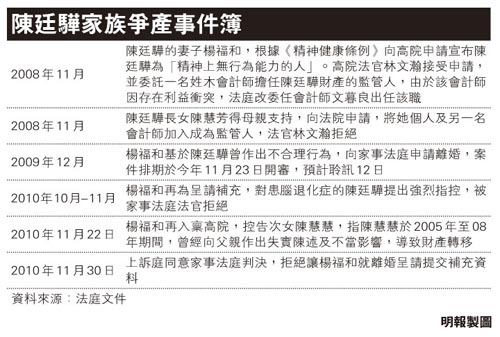 知情人士透露,陳慧芳于2008年回港后,即使與胞妹陳慧慧交惡,各人也極為緊張父親的名聲,上周楊福和控告次女,已經(jīng)令家族不和消息甚囂塵上,如今再以不合理行為申請離婚,對年老又患病的陳廷驊的聲譽(yù)影響更大。