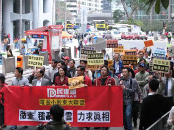 中新網(wǎng)2月9日電 據(jù)香港《大公報》報道,香港電盈小股東大聯(lián)盟8日舉行大游行,促請證監(jiān)會盡快徹查電盈懷疑“種票”事件,約百名電盈小股東出席。