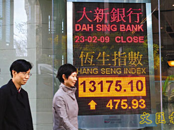 中新網(wǎng)2月24日電 據(jù)香港《文匯報(bào)》報(bào)道,市場(chǎng)消息指花旗集團(tuán)尋求美國政府增加持股量以強(qiáng)化股本,消息紓緩?fù)顿Y者對(duì)銀行業(yè)的憂慮,加上內(nèi)地A股造好,好友趁勢(shì)挾倉,帶動(dòng)港股23日借勢(shì)反彈,重上13000水平。