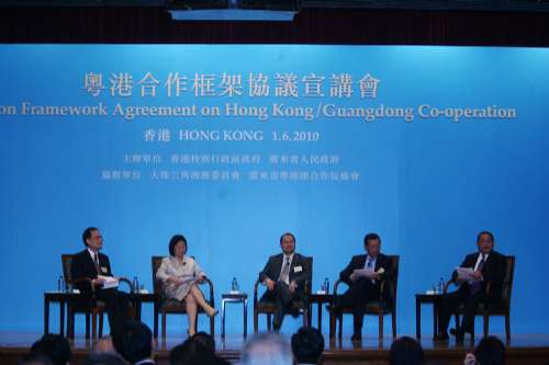 曾蔭權在致辭時說,粵港合作三十多年前已經開展,未來三十年將在堅實的合作基礎上,進行更清晰的發(fā)展定位和分工。他說,《框架協(xié)議》把《珠江三角洲地區(qū)改革發(fā)展規(guī)劃綱要》的宏觀政策,化為有利粵港發(fā)展的具體措施,為深化粵港合作提供了有用的平臺,有助雙方日后爭取更多“先行先試”的措施。