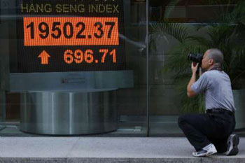 香港股市20日跟據外圍高開200點,輕易升破19000點關口拾級而上,中午收市升447點,在深滬股市推波助瀾之下,港股午市升勢持續(xù)擴大,最多升700點,金融股及地產股齊齊為股市添動力,指數以接近全日高位收市,報19502點,上升696點或3.7%,多只藍籌股重返去年由雷曼爆煲引發(fā)的金融海嘯前水平,國企指數升幅超過4%或446點,收市報11593點。