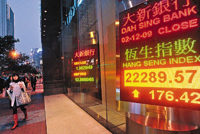中新網(wǎng)12月3日電 據(jù)香港《文匯報(bào)》報(bào)道,外圍股市繼續(xù)造好,迪拜世界的陰霾看似消散,加上市場(chǎng)憧憬迪拜世界事件將拖慢各國(guó)政府的退市時(shí)間表,港股連升第3天,最多曾升326點(diǎn),午后由于投資者觀望美國(guó)3日公布的最新經(jīng)濟(jì)數(shù)據(jù),港股升幅收窄,恒指全日收?qǐng)?bào)22289.5點(diǎn),升176.4點(diǎn),成交額783億元,3天已累升逾1100點(diǎn)。