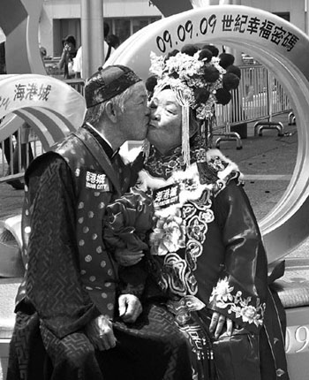 9月8日,六對夫婦與情侶身穿中西結婚禮服,一起親吻作愛的見證。為與天下有情人在09年9月9日(09.09.09)這世紀一遇的“長長久久”日子共度最浪漫時刻,香港海港城特別在當日舉行宣傳活動。 中新社發(fā) 譚達明 攝