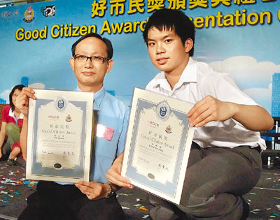 18日共有40名好市民得獎(jiǎng),15歲的容啟聰為最年輕的得獎(jiǎng)?wù)。本?月,他參加運(yùn)動(dòng)會(huì)時(shí)發(fā)現(xiàn)一名可疑男子把一些手袋放到運(yùn)動(dòng)場(chǎng)外的私家車(chē)上,懷疑他偷去同學(xué)的財(cái)物,于是立即通知老師胡文安,并與胡一起追截該男子。該男子其后駕車(chē)逃去,他們立即記下其車(chē)牌號(hào)碼及報(bào)案。