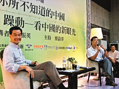 “思沙龍”以《你所不知道的中國(guó)》為題,參加人數(shù)超過(guò)300人,據(jù)說(shuō)還有不少人不得其門(mén)而入。梁振英在演講中不忘“銷(xiāo)港”,談到過(guò)去30年,香港也參與在內(nèi)地的改革開(kāi)放之中,香港與內(nèi)地的互動(dòng)發(fā)展不僅在經(jīng)濟(jì)方面,而在文化、生活方式、語(yǔ)言、以至觀念等各方面都已經(jīng)發(fā)展到“你中有我,我中有你”的相互影響的狀況。