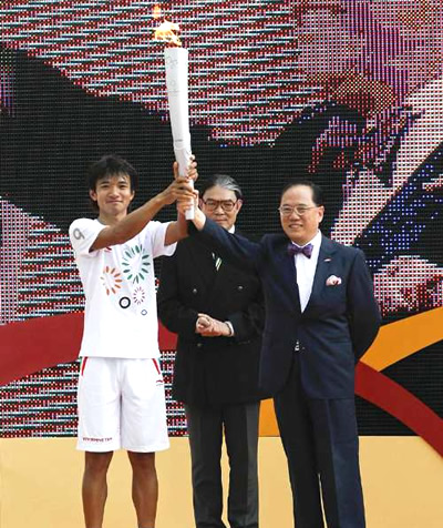 火炬?zhèn)鬟f的起步儀式,昨午三時在九龍公園的露天廣場舉行。此次大會安排了六十五名火炬手負責火炬?zhèn)鬟f,當中八成是運動員,煥發(fā)著青春活力。去年奧運圣火在香港傳遞時,分別跑第一棒的李麗珊和跑最后一棒的黃金寶,昨日互換位置,由黃金寶跑第一棒,李麗珊負責壓軸一棒;鹁嬗杉馍尘组_始傳送,經(jīng)過一段海路,最后到達金紫荊廣場,歷時個半小時。