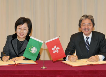24日,香港財政司司長曾俊華及澳門政法務(wù)司司長陳麗敏在香港簽署了《中華人民共和國香港特別行政區(qū)政府與中華人民共和國澳門特別行政區(qū)政府關(guān)于持永久性居民身份證入出境及互免填報入出境申報表協(xié)議》。這標志港澳兩地在出入境事務(wù)方面的合作進入新的階段。