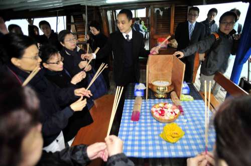 港府近年推廣骨灰海葬,惟租用私營船只費用高昂,需花費二千至四千元,食環(huán)署特別推出免費渡輪服務(wù),估計每年可處理近五百宗申請,每年支出約十八萬元。渡船服務(wù)自上月三十一日起接受申請,截至昨日共收到二十三宗申請,反應(yīng)不錯。其中六個家庭率先于昨日啟航。他們小心翼翼地捧著六個骨灰甕,渡船由西灣河公眾碼頭出發(fā),前往東龍洲以東海域,準(zhǔn)備為這些往生者“集體海葬”。