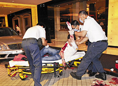 現(xiàn)場(chǎng)為尖東么地道香格里拉酒店門(mén)外,4日凌晨4時(shí)許,“泰龍”偕一男友人在酒店消遣后離開(kāi),行至酒店大門(mén)外分頭各自取回一輛名貴平治房車(chē)和一輛保時(shí)捷跑車(chē),當(dāng)“泰龍”剛走到平治座駕旁,突有2輛車(chē)從前后高速駛至,其中一輛7人車(chē)從酒店行車(chē)通道入口直沖向他,“泰龍”閃避不及被撞至飛彈落地。另一輛私家車(chē)則從通道出口逆線(xiàn)駛?cè),?chē)上跳出3名分持開(kāi)山刀殺手,直撲“泰龍”揮刀狂砍。