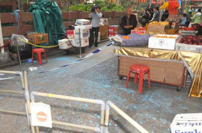 中新網(wǎng)3月15日電 據(jù)香港《大公報(bào)》報(bào)道,香港柴灣道一間水果攤因拒交“陀地”費(fèi)5年來頻被黑幫滋擾,患癌店東受刺激致病情惡化去世,遺孀和兩子接手后滋擾仍未間斷,14日晨店鋪開業(yè)時(shí),被兩名惡漢突然走近潑淋藍(lán)色油漆,少東走避不及輕微濺中,另一名街坊婆婆經(jīng)過也中招,幸有驚無險(xiǎn)。