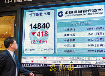 中新網(wǎng)4月28日電 據(jù)香港《文匯報(bào)》報(bào)道,雖然上周五美股上升,但在豬流感疫情擴(kuò)散的影響下,港股27日低開98點(diǎn)后,加上工行外資股東限售股28日解禁,令內(nèi)銀股受壓,恒指隨后失守15000點(diǎn),收?qǐng)?bào)14840點(diǎn),跌418點(diǎn)或2.74%,國(guó)企指數(shù)跌337點(diǎn),報(bào)8641點(diǎn),大市成交530億元。