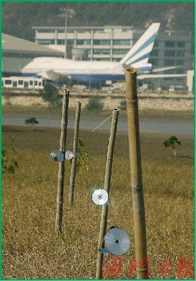 民署為免雀鳥在堆填區(qū)和淺灘覓食,到處亂飛而影響航班升降,18日上午派出工程人員在堆填區(qū)架設(shè)由回收光盤組成的反光裝置。該反光裝置由四片組成一個(gè)三角錐體,再以一條魚絲懸空吊在竹枝上,反光裝置可隨風(fēng)飄揚(yáng),將陽(yáng)光向四周折射,干擾雀鳥活動(dòng),從而驚嚇雀鳥。