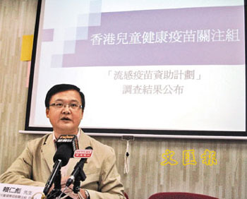 關(guān)注組召集人賴仁彪批評,特區(qū)政府對流感疫苗資助計劃的宣傳不足,令全港30萬合資格兒童,只有8萬劑的接種量,令兒童在流感高峰期沒有足夠保護。他希望特區(qū)政府能改善計劃的執(zhí)行細節(jié),最重要是令家長明白如何使用服務,及令基層、不常接觸計算機的家長,容易獲取參與計劃的私家醫(yī)生名單及收費資料。