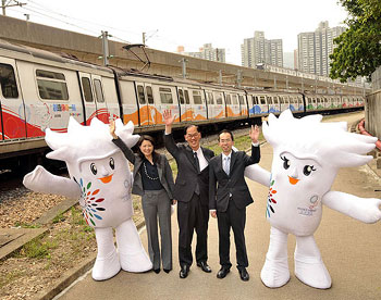 該三列色彩繽紛的港鐵列車,以東亞運(yùn)吉祥物“東仔”和“亞妹”所展示的比賽項(xiàng)目作裝飾,19日起在港島線、九龍線及荃灣線行走。
