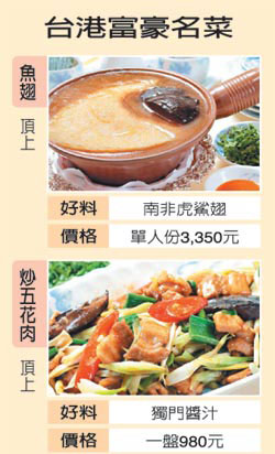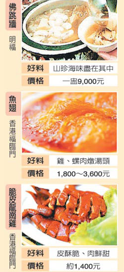 其中福臨門就是眾所公認(rèn)的富豪飯?zhí)茫嗥るu、燕窩、魚翅與荷葉糯米飯,在質(zhì)量與口碑上都是一等一,價(jià)格也成正比,以套餐為例,一客魚翅、25頭吉品鮑、龍蝦、乳鴿、炒飯加燕窩要港幣2500元。此外鮑魚大王楊貫一的富臨飯店、四季酒店中米其林三星的龍景軒也都算得上是富豪飯?zhí)谩?/p>