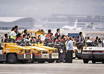 上月底,因為資方停發(fā)“工作表現(xiàn)獎”,機場地勤服務(wù)公司員工進行歷時3小時的“警示式罷工”,半癱瘓機場6小時;在香港勞工處斡旋下,勞資雙方5日進行談判。