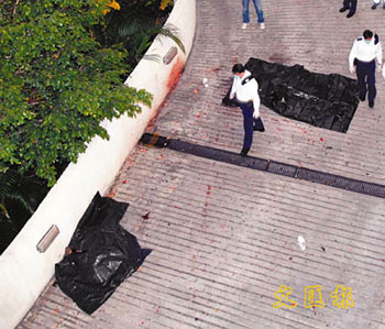 有街坊聽到一聲巨響后,發(fā)現(xiàn)一男一女倒伏在芷葵樓一條緊急車輛通道,兩人相距約3米,大驚之下致電報警。救護員到場,證實兩人頭爆肢折當(dāng)場死亡,警員事后以帆布架遮蓋尸體,然后上樓追查兩人墮樓位置。