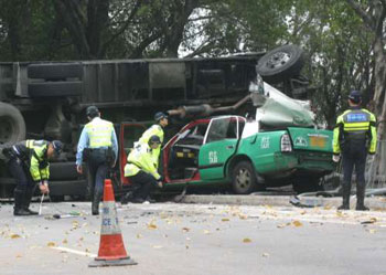 消防員接報趕至現(xiàn)場,發(fā)現(xiàn)被壓扁的的士車廂內(nèi)躺著6名男子,但已全部氣絕身亡,部分人更被壓至面貌變形,頭顱爆裂。警方事后驗出被告酒精含量是153微克,超標(biāo)6倍半。