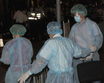 5日晚約9時,一輛救護車停泊在維景酒店門外,1名穿上“全副武裝”保護衣的醫(yī)護人員進入酒店,準(zhǔn)備接走2名墨西哥人往機場。