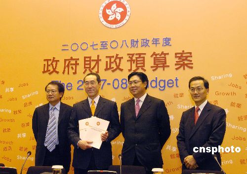 香港財(cái)政司司長唐英年手持07-08年政府財(cái)政預(yù)算案文本與財(cái)經(jīng)事務(wù)及庫務(wù)局局長馬時(shí)亨、財(cái)經(jīng)事務(wù)及庫務(wù)局常任秘書長(庫務(wù))黎年(左一)及政府經(jīng)濟(jì)顧問郭國全(右一)在政府合署會(huì)議廳會(huì)見記者。中新社發(fā) 鄧慶樂 攝