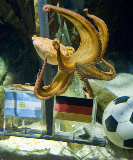 中新網(wǎng)7月2日電 據(jù)外媒7月1日報道,德國有只名為保羅的章魚最近很紅,因為它已準確預測了四場比賽結果。在即將到來的德阿之戰(zhàn)中,保羅又看好德國,這令德國球迷興奮,阿根廷球迷心堵。但近日,一只來自阿根廷的海豚向保羅發(fā)起挑戰(zhàn),海豚似乎更青睞于阿根廷。